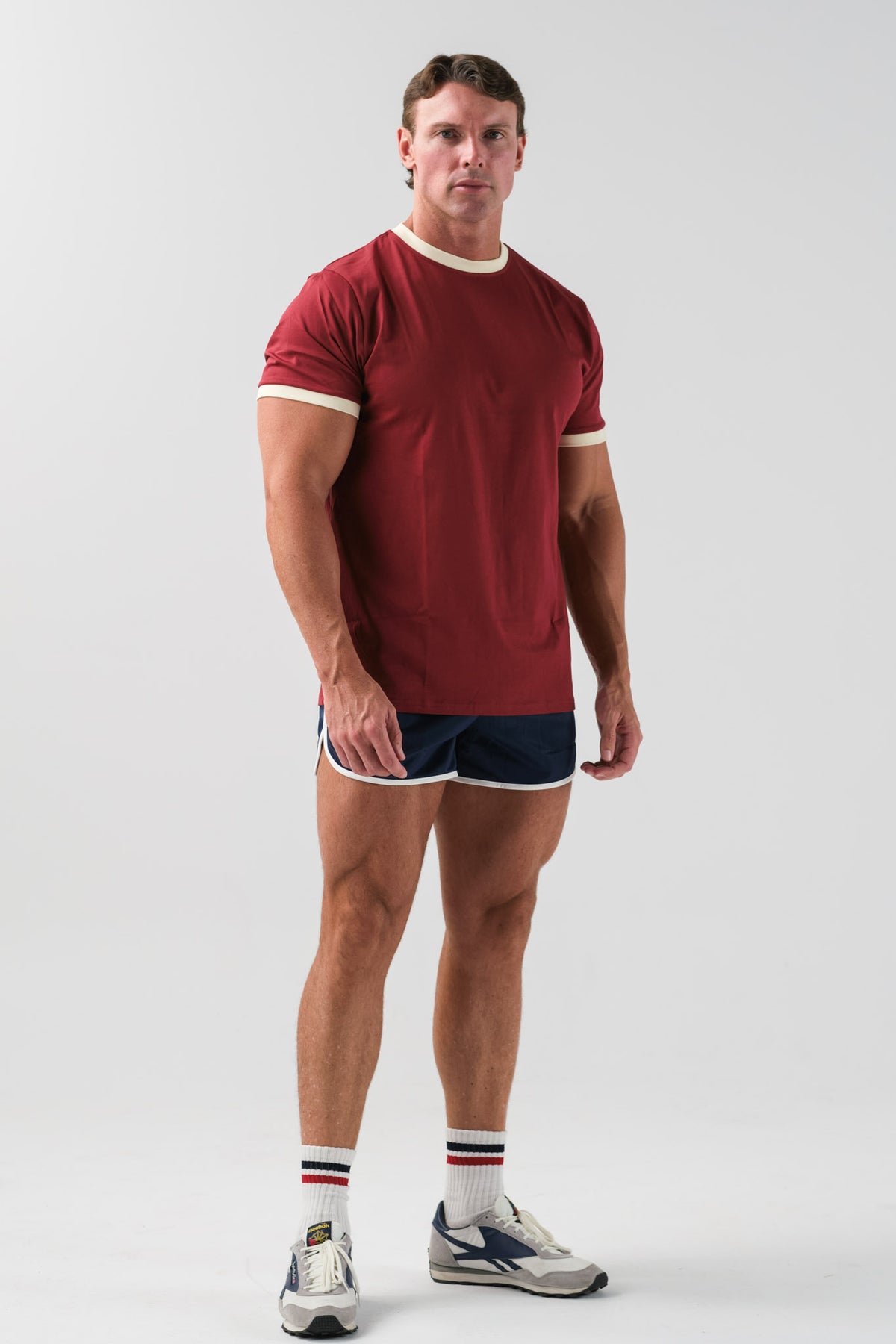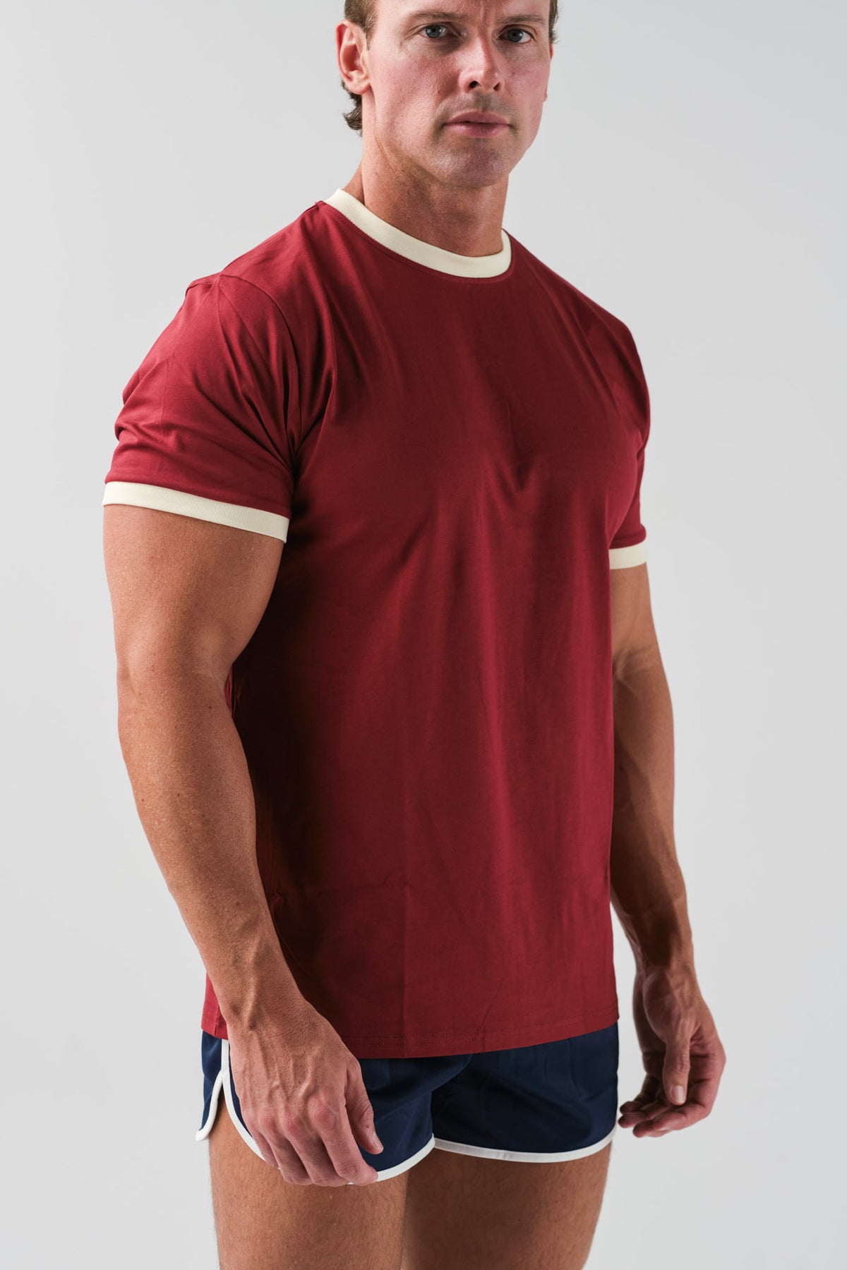 Our perfect fitting essentials ringer tee in a classic maroon and off white.